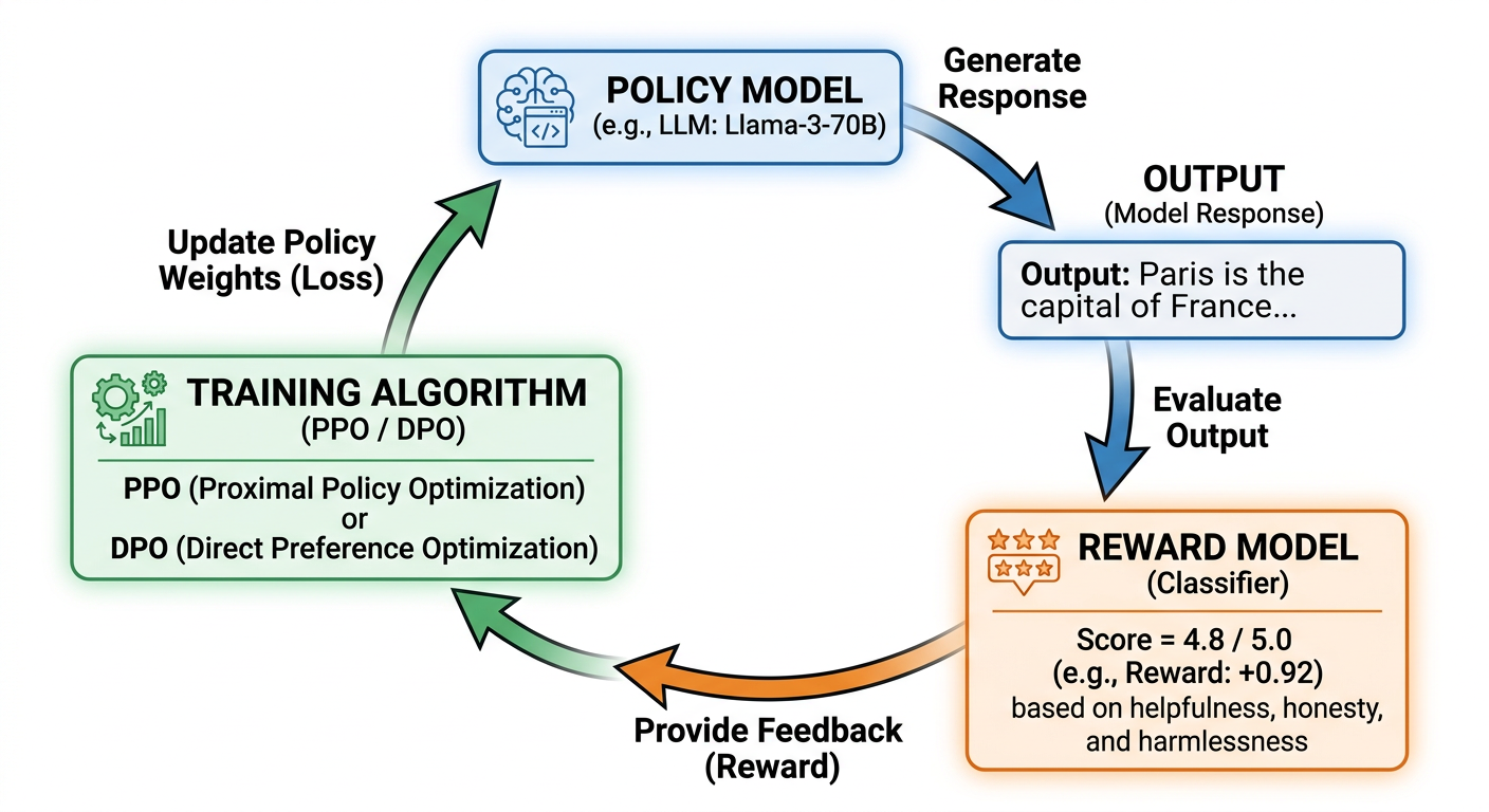 3. PPO/DPO/GRPO updates policy based on rewards